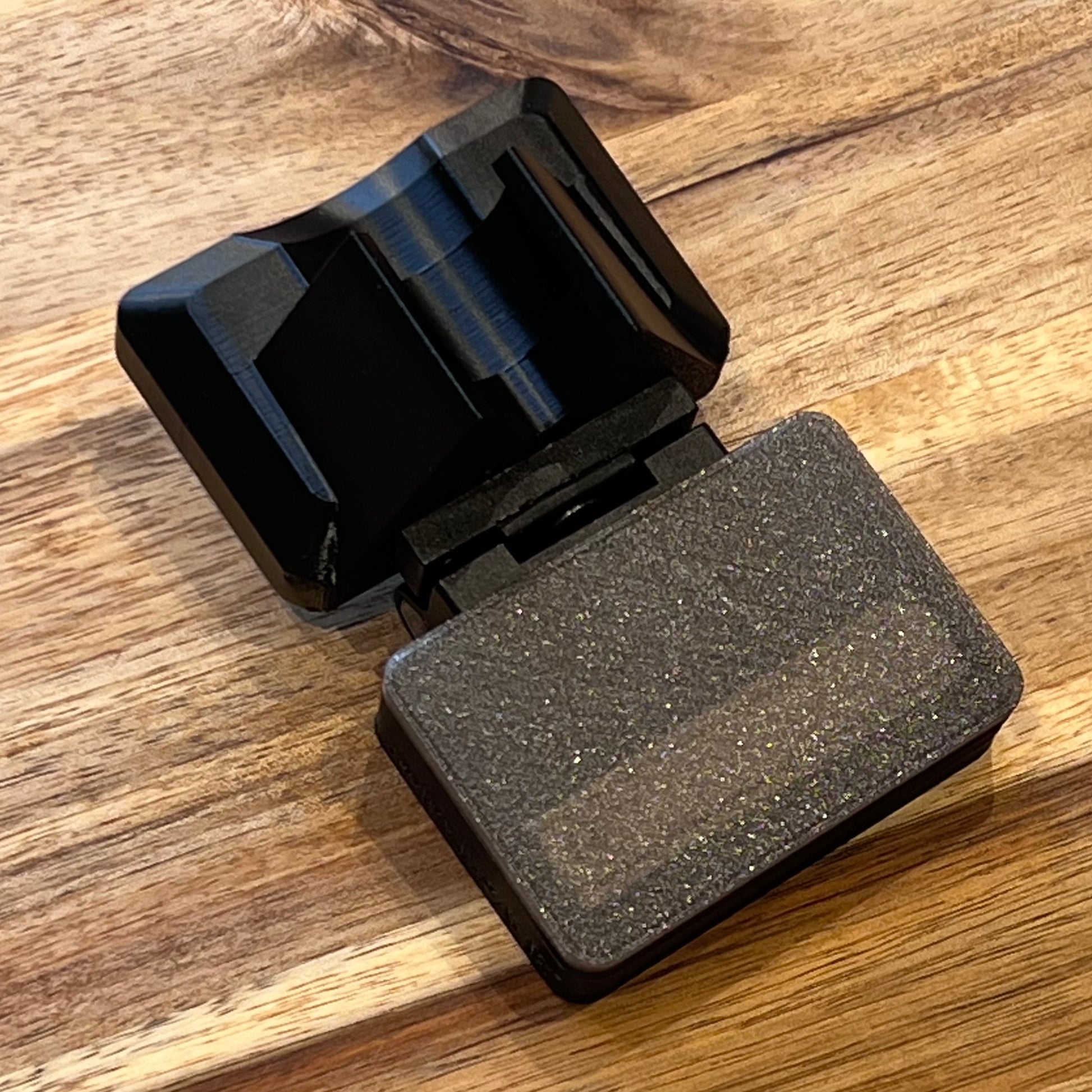 Support aimanté réglable pour pommeau de douche / douchette. Une charnière freinée et réglable grâce à une vis permet de modifier le couple de la charnière.